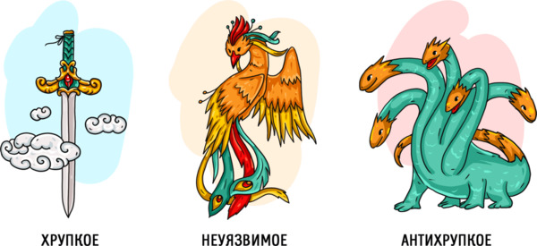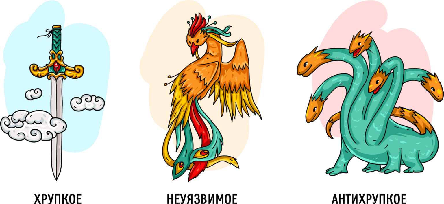 Антихрупкость — это не эластичность, гибкость или неуязвимость. Гибкое либо эластичное противостоит встряске и остается прежним; антихрупкое, пройдя сквозь испытания, становится лучше прежнего. Примером «хрупкого» объекта в мифологии является дамоклов меч, который в любую секунду от легкого ветерка может упасть и убить Дамокла, птица-феникс, которая предвидя смерть, сжигает себя, а затем возрождается вновь, будет выступать в роли «неуязвимого» объекта. А вот Лернейская гидра будет «антихрупким» объектом, так как отрубив гидре одну из голов, на ее месте сразу вырастут 2 новые.