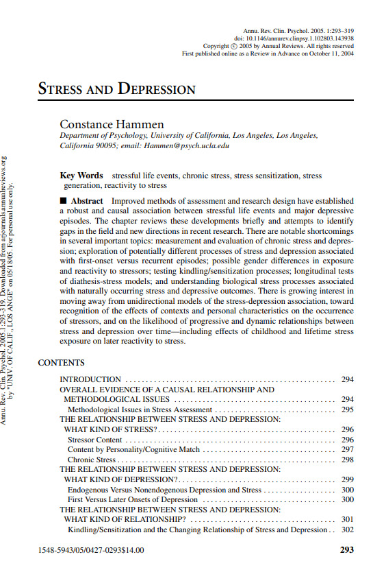 Содержание В обзорной статье «Stress and Depression», опубликованной в 2005 году в Annual Review of Clinical Psychology, Констанс Хаммен представляет всесторонний анализ современного состояния исследований взаимосвязи между стрессом и депрессивными расстройствами. Отправной точкой служит констатация того, что благодаря усовершенствованным методам оценки и дизайна исследований причинная связь между стрессовыми жизненными событиями и развитием большого депрессивного эпизода может считаться прочно установленной. Однако главная задача, которую ставит перед собой автор, — выйти за рамки этой общей констатации и обозначить наиболее перспективные и одновременно проблемные направления, требующие дальнейшего изучения. Первый крупный блок посвящен вопросу спецификации стресса. Хаммен подчеркивает, что не все стрессоры равны с точки зрения их депрессогенного потенциала. Опираясь на традицию исследований Брауна и Харрис, она указывает на особую значимость тяжелых событий, связанных с межличностной утратой и унижением. Однако в центре внимания оказывается не только эпизодический, но и хронический стресс, который, как показывают данные, часто является не менее, а иногда и более сильным предиктором депрессивной симптоматики. Автор призывает к разработке более четких определений и методов оценки хронического стресса и к изучению его сложного взаимодействия с острыми событиями, которые могут как потенцировать, так и, по некоторым данным, ослаблять эффект друг друга. Второй ключевой раздел касается гетерогенности самой депрессии. Хаммен рассматривает два аспекта: различие между первым и последующими эпизодами, а также вопрос о так называемых «эндогенных» (меланхолических) подтипах. Анализ литературы показывает, что данные о связи стресса с первым эпизодом остаются противоречивыми и страдают от методологических ограничений, ключевым из которых является отсутствие внутрииндивидуальных (within-person) лонгитюдных дизайнов. Это непосредственно подводит к обсуждению гипотезы «киндлинга» или сенситизации, согласно которой с ростом числа перенесенных эпизодов для запуска нового эпизода требуется все меньше стресса, а в пределе эпизоды могут возникать и спонтанно. Работы Кендлера и коллег предоставляют частичную поддержку этой гипотезе, демонстрируя, что у лиц с низким генетическим риском эффект стресса действительно убывает по мере накопления эпизодов, тогда как генетически уязвимые индивиды с самого начала находятся в состоянии, близком к «предкиндлингу». Наиболее оригинальным и влиятельным вкладом Хаммен в развитие данной области является концепция «генерации стресса». В противовес традиционному представлению о стрессе как о внешнем, случайном факторе, она показывает, что люди с историей депрессии (и особенно женщины) активно участвуют в создании стрессовых событий, прежде всего в межличностной сфере. Эти события, в свою очередь, повышают риск рецидива, формируя порочный круг депрессии и стресса. Исследования Хаммен и ее коллег убедительно демонстрируют, что генерация стресса не сводится к симптомам текущей депрессии, а связана с устойчивыми характеристиками, такими как невротизм, особенности межличностного функционирования, а также с влиянием депрессии родителей и дисфункциональной семейной среды, закладывающей основы для будущих меж