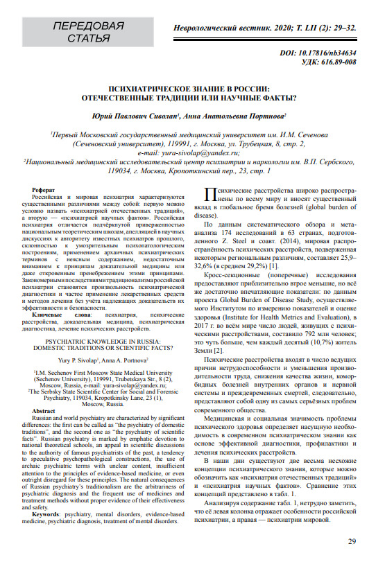 Содержание В статье анализируются фундаментальные различия между российской и мировой психиатрией. Авторы сопоставляют два подхода: «психиатрию отечественных традиций», опирающуюся на авторитет прошлого, умозрительные построения и субъективный клинический опыт, и «психиатрию научных фактов», основанную на принципах доказательной медицины, формализованных диагностических критериях и данных контролируемых исследований. Рассматриваются последствия традиционализма: произвольность диагностики, использование устаревших и стигматизирующих терминов, полипрагмазия и применение методов с недоказанной эффективностью. Авторы приходят к выводу о необходимости преодоления обособленности российской психиатрии и интеграции в мировое научное пространство. В статье, опубликованной в 2020 году, профессор Юрий Павлович Сиволап (Первый МГМУ им. И.М. Сеченова) и Анна Анатольевна Портнова (НМИЦ психиатрии и наркологии им. В.П. Сербского) предлагают острую и принципиальную критику современного состояния отечественной психиатрии. Авторы выделяют два противоположных вектора развития психиатрического знания. Первый — «психиатрия традиций» — характеризуется: