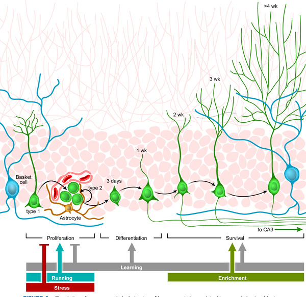 Нейрогенез также регулируется многими поведенческими факторами. Бег - один из самых мощных стимуляторов нейрогенеза, повышающий выживаемость нейронов на стадии их созревания. Напротив, стресс является серьезным негативным регулятором рождения новых нейронов. Эффекты обучения более сложны: на одних этапах они подавляют процесс нейрогенеза, а на других усиливают его.